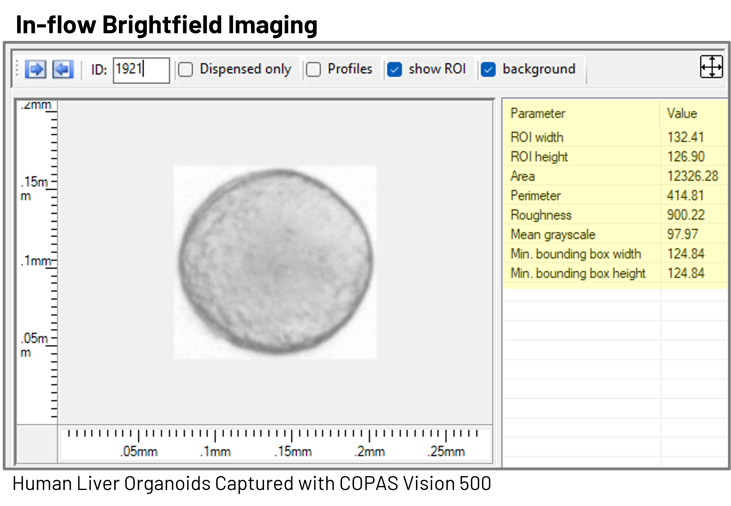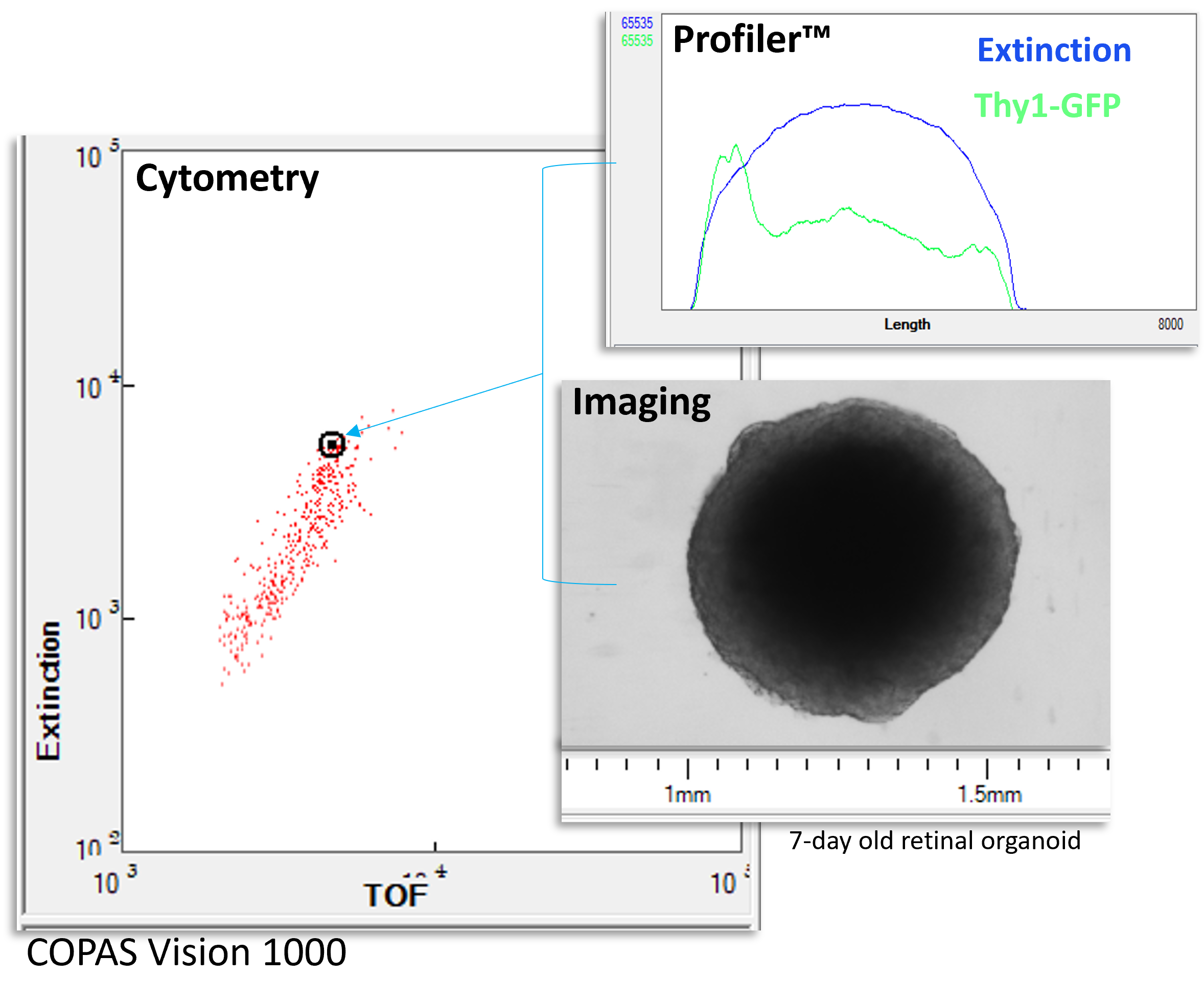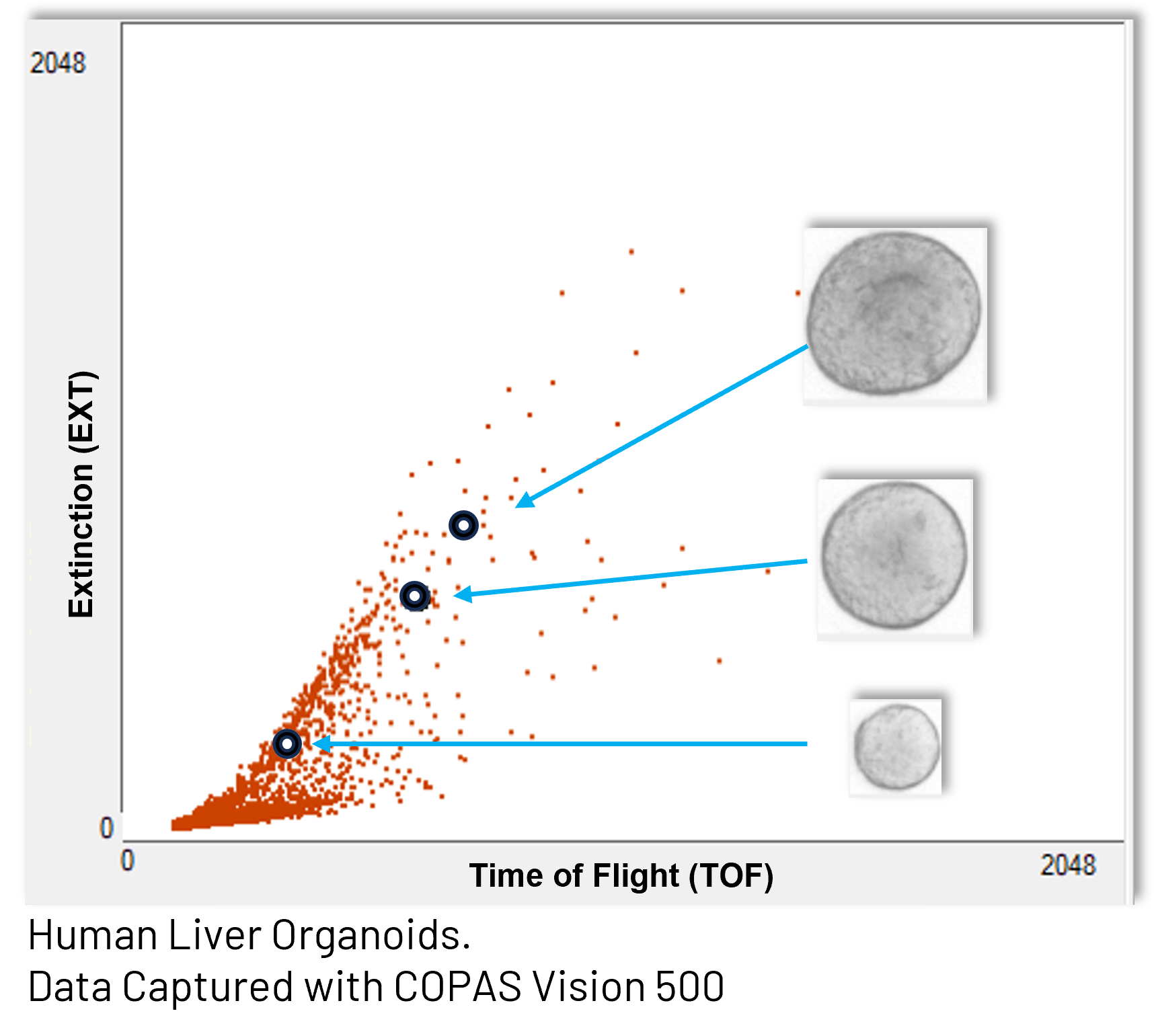 The COPAS Vision™ brings together population-level cytometry data, object-level Profiler data, and in-flow brightfield imaging into a single, integrated workflow. As each organoid passes through the flow cell, optical measurements are collected alongside brightfield images, creating a multidimensional dataset that links quantitative signals directly to visible morphology.