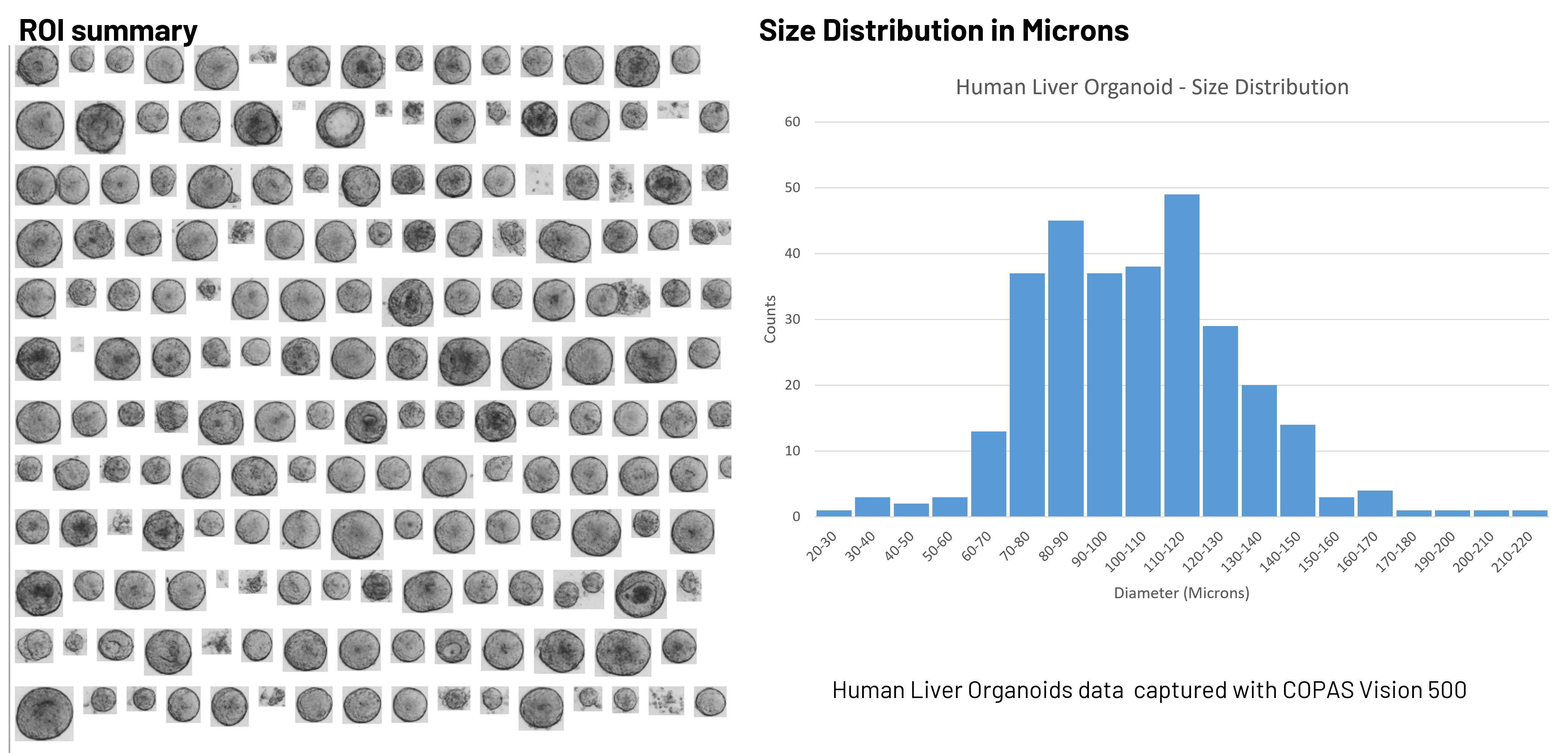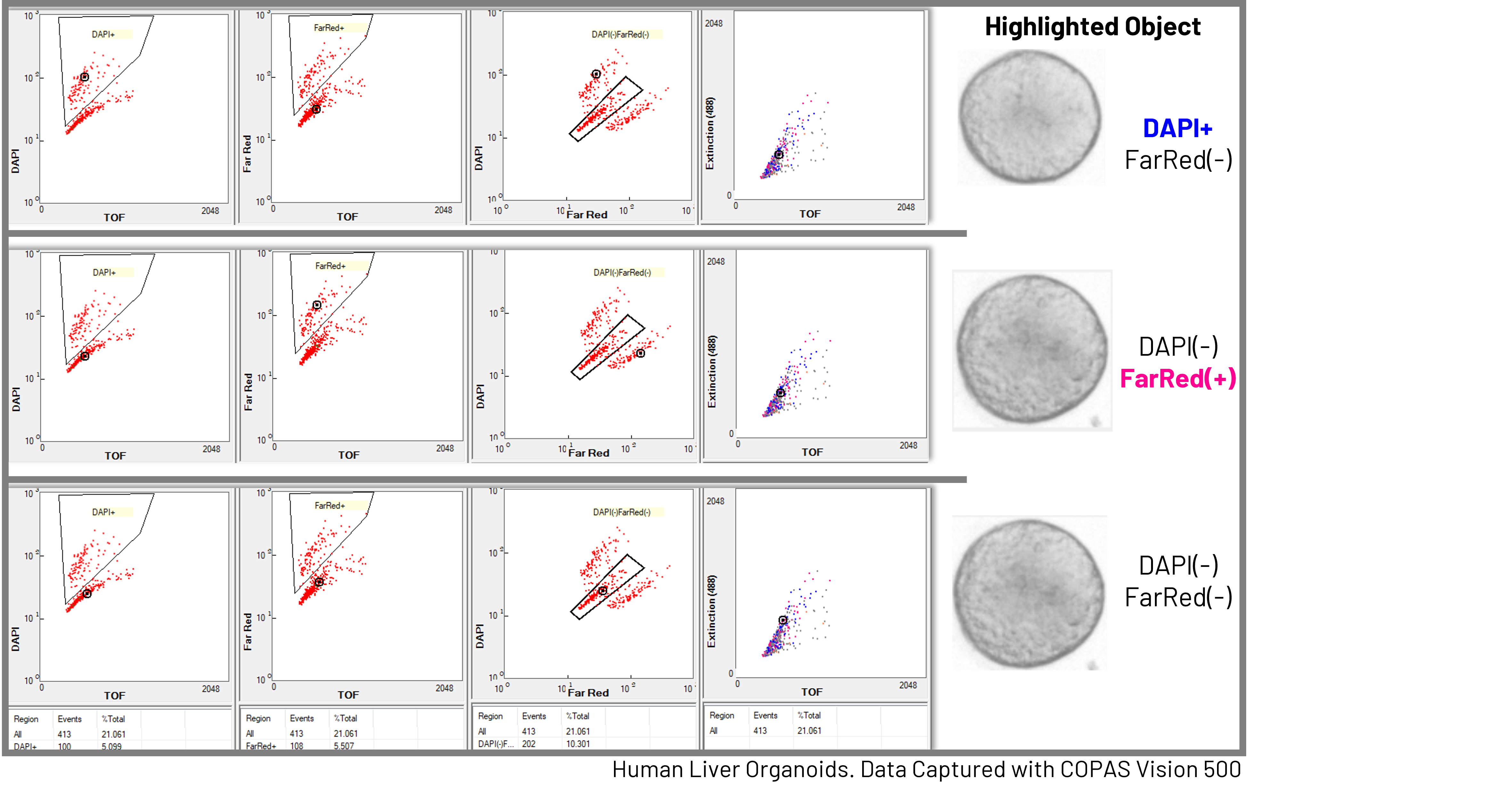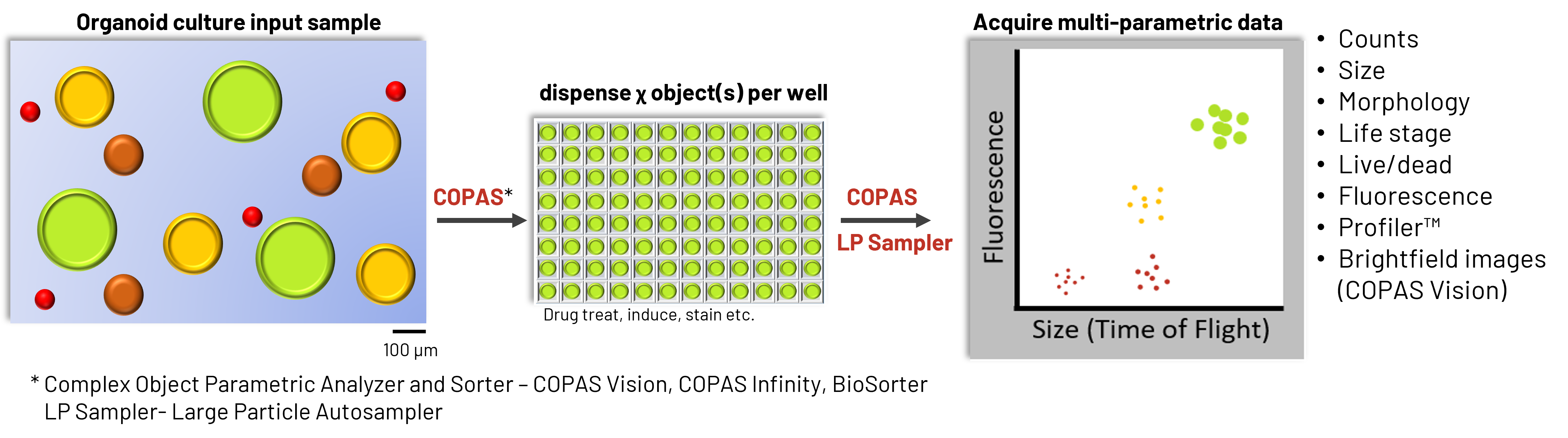 The COPAS Vision™ brings together population-level cytometry data, object-level Profiler data, and in-flow brightfield imaging into a single, integrated workflow. As each organoid passes through the flow cell, optical measurements are collected alongside brightfield images, creating a multidimensional dataset that links quantitative signals directly to visible morphology.